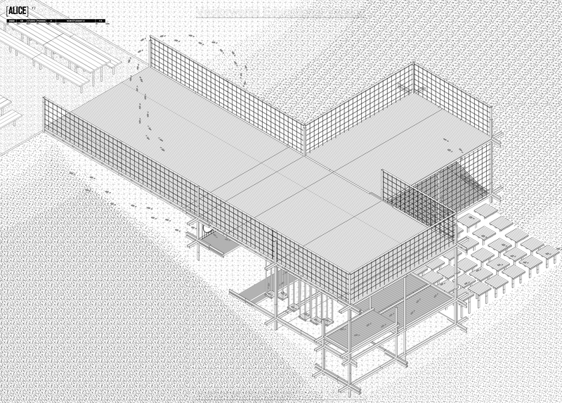 Axonometry of the room placed on site. Apart from the monge these drawing allows us to understand a little bit more how the human activity will be developed within the structure. Both, the upper part and the lower part are accesible and connected to one another by a net that allows that people to go from one space to another. As it is shown with the path the room has two main access, one from the picnic place and the other from the ground. In addition, these steps also show the path to follow inside the structure in orther to be able to the enjoy the playground to the fullest.