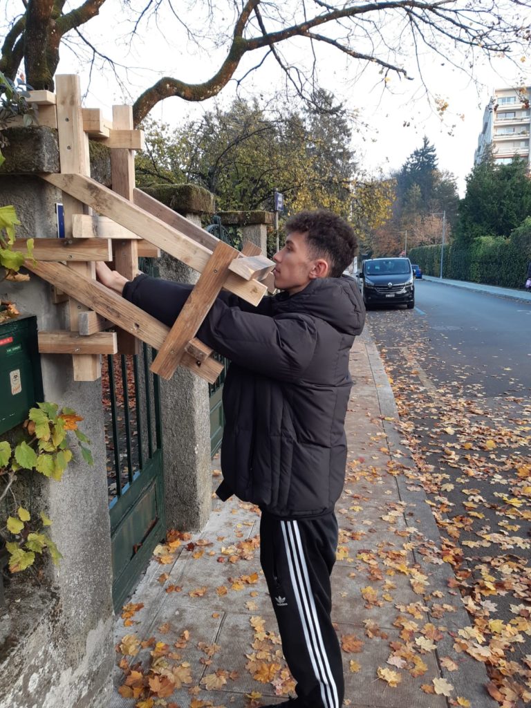 The other difficulty was to make a frame that fits perfectly into the pillar (which was irregular), and to create a second frame which didn’t need anything (screws, bolts), to be attached to the first one. For a better precision to make regular 30 degrees angle cuts, we did a template.